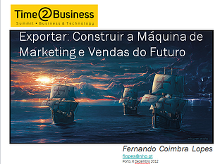 Na passada semana, dias 6 e 7, teve lugar na Exponor o evento Time2Business que contou com um conjunto de mais de 30 conferencistas. No dia 6 apresentei a sessão com o nome "Exportar: Construir a Máquina de Marketing e Vendas do Futuro". Descarregue aqui a apresentação (já não está disponível).